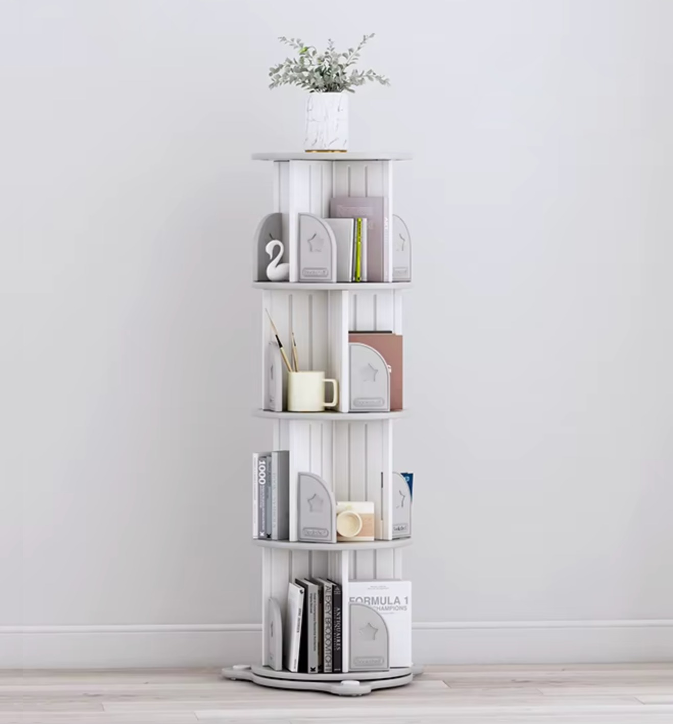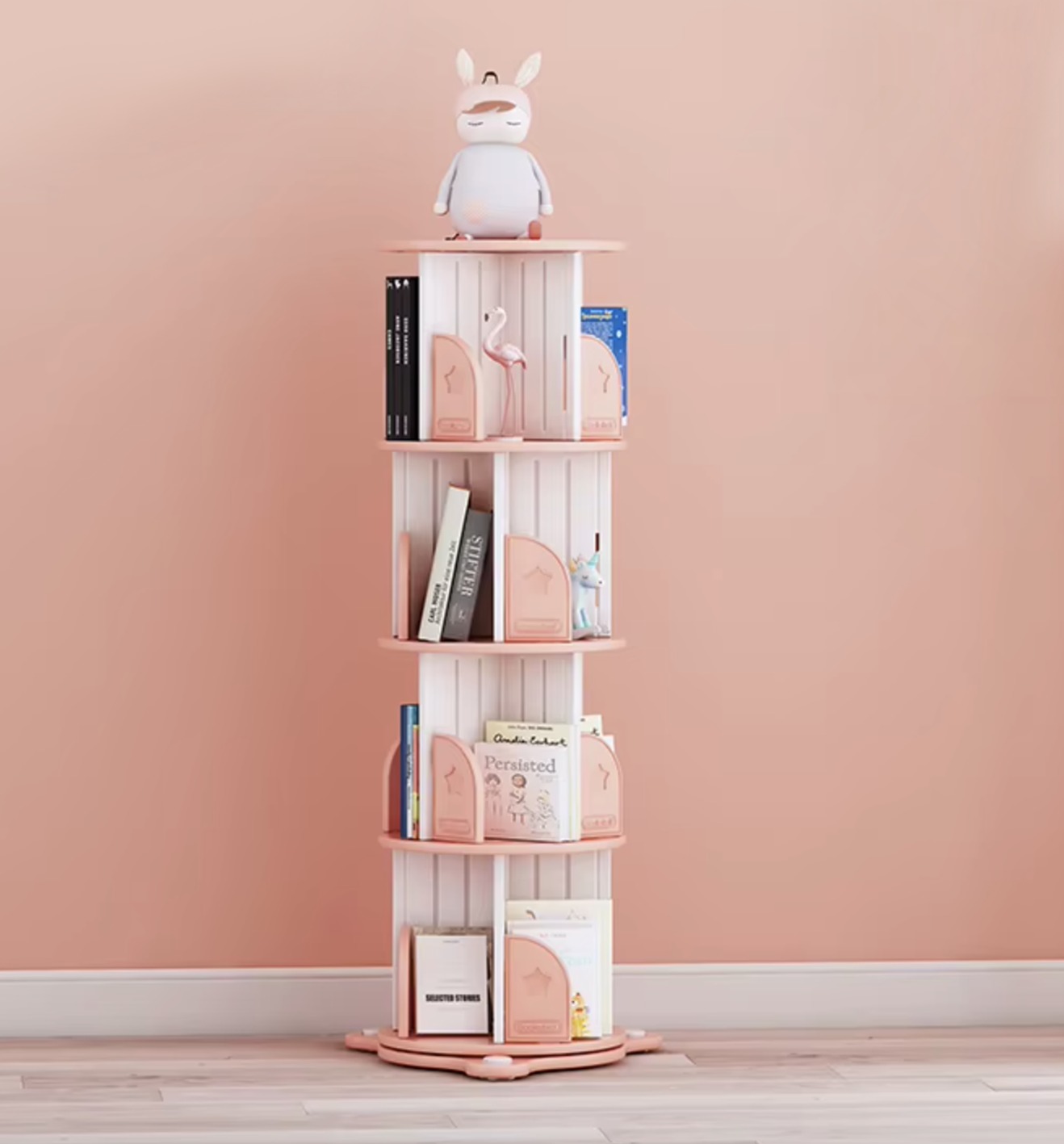 Optimisez l'espace de la chambre de votre enfant avec cette bibliothèque rotative à quatre niveaux, conçue pour allier praticité et esthétique. Sa structure verticale et pivotante permet un accès à 360° à tous les livres et objets décoratifs, même dans les coins les plus exigus. Le design charmant, avec ses séparateurs délicats et ses bords arrondis, crée un environnement de lecture accueillant tout en assurant la sécurité des plus jeunes. Cette colonne de rangement pivotante est la solution idéale pour garder les livres organisés et à portée de main, encourageant ainsi l'autonomie et le goût de la lecture chez l'enfant.